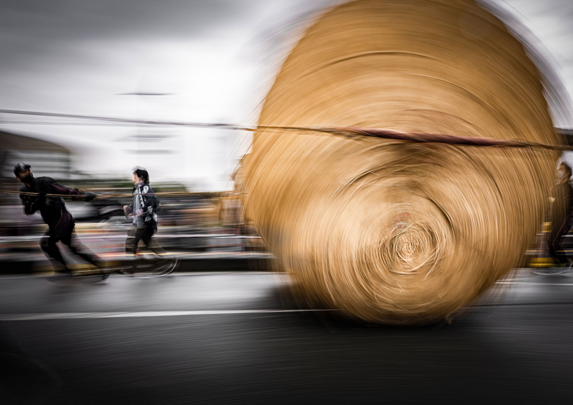 It seems to depict a festival involving the rolling of giant straw bags, and the idea to express this scene through a slow shutter effect using an ND filter was a great touch. The control of focus and color development played a significant role, resulting in a truly unique representation. This piece succeeds in piquing the viewer's curiosity, making them think 'Oh, what's this?' I believe it's a work that skillfully leverages the characteristics of the filter to capture and enhance the inherent energy of the subject.
