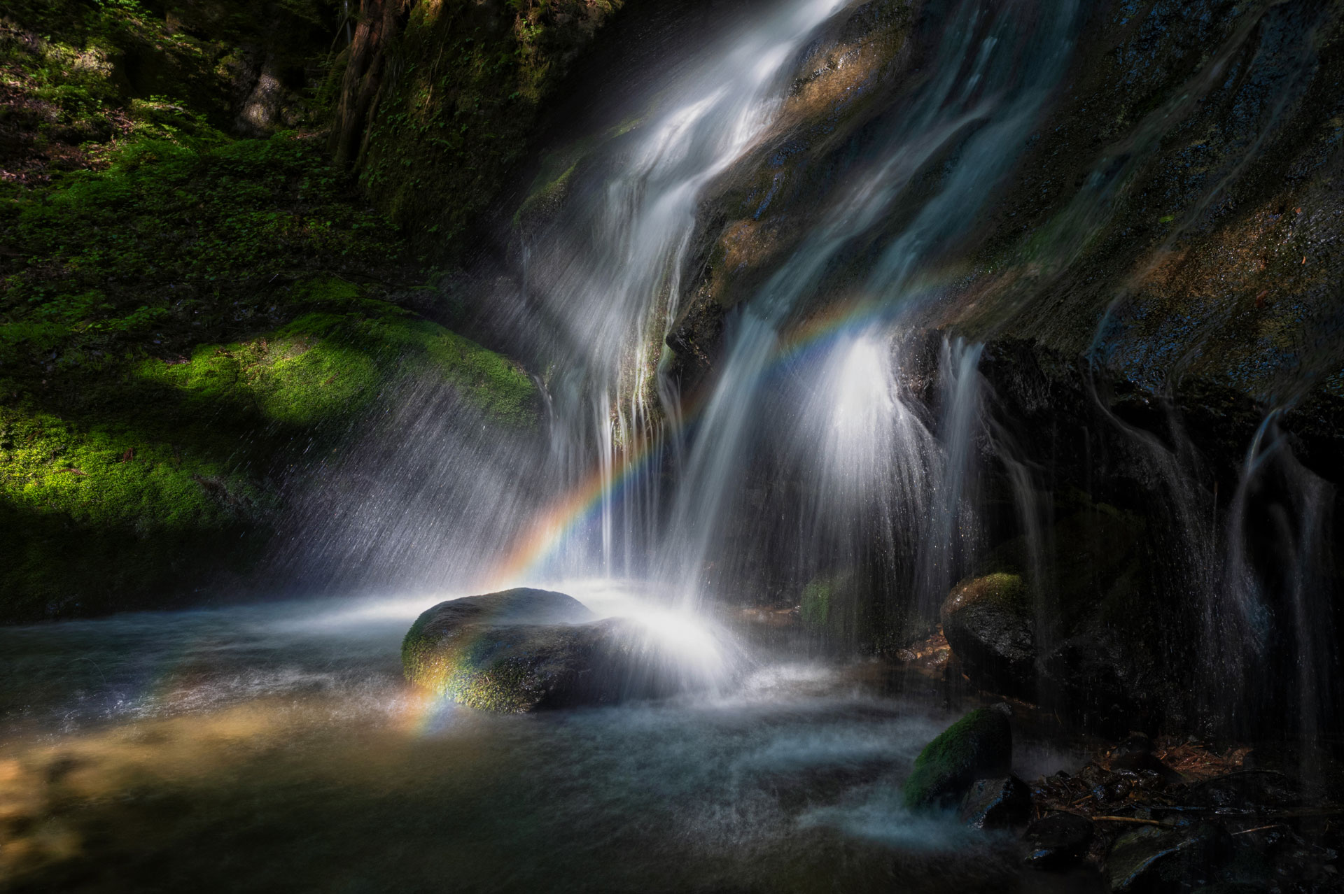 The waterfall in the morning sunlight was achieved with an ND filter for a moderately long second. In addition, a slight effect of PL filter was used to emphasize the rainbow.
