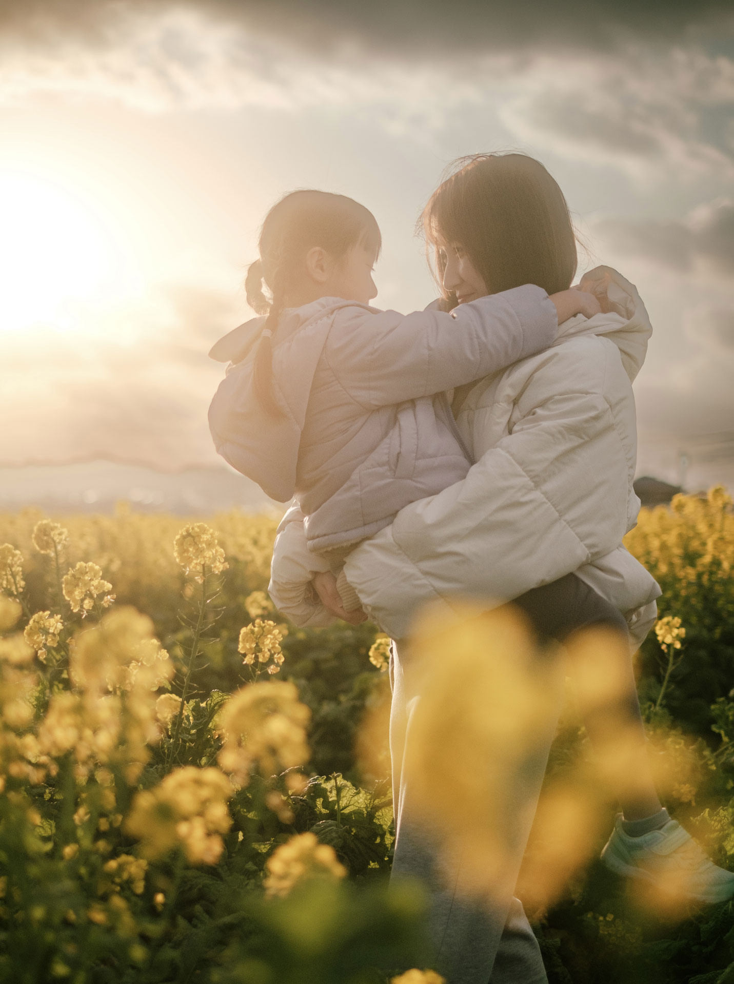 I went to canola flower fields with my daughters. These are canola flower and sisters illuminated by the setting sun.